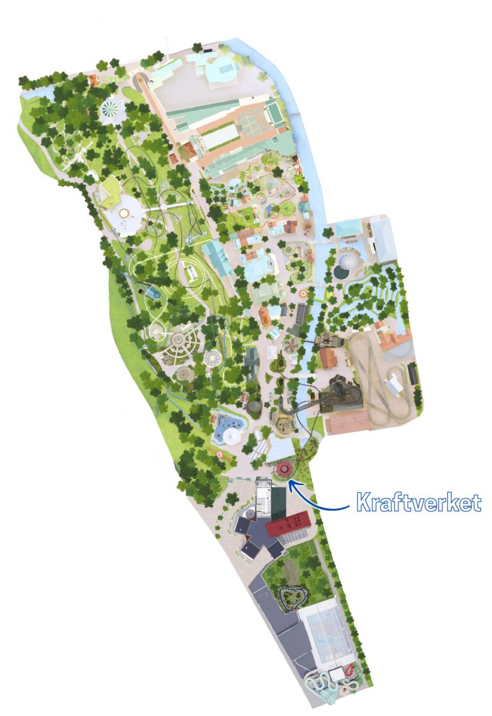 L’attraction Kraftverket est située sous l’une des boucles de la montagne russe Valkyria (un Dive Coaster de Bolliger & Mabillard), localisée à l’entrée Sud du parc, juste à côté du Liseberg Grand Curiosa Hotel.