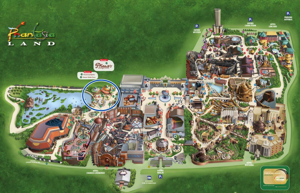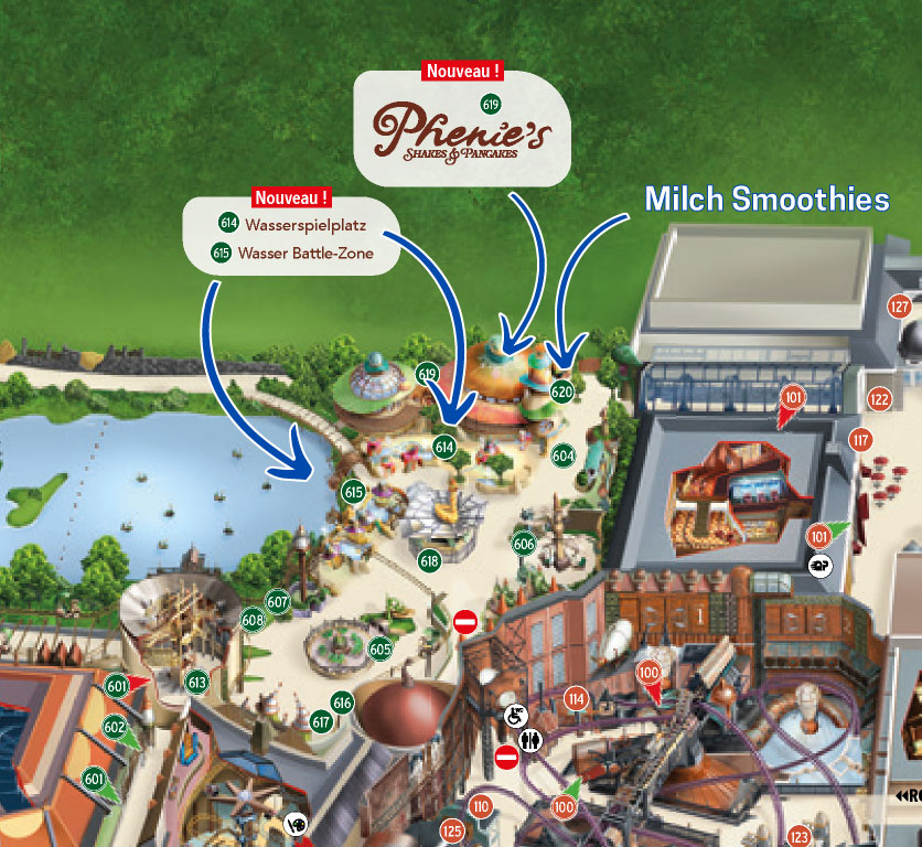 Ces 4 nouveautés sont localisées dans l’univers thématique Wuze Town (la ville des enfants), juste après la verrière de l’univers Berlin et autour du point de restauration Schwan Snack. Elles ne remplacent pas d’attraction ni de bâtiment mais la terrasse du Schwan Snack.