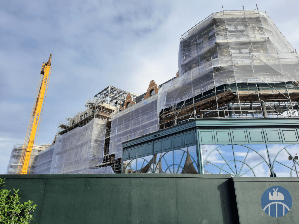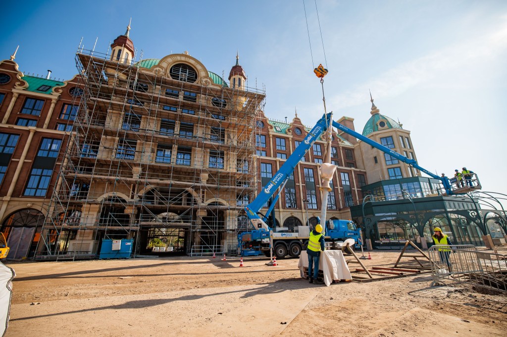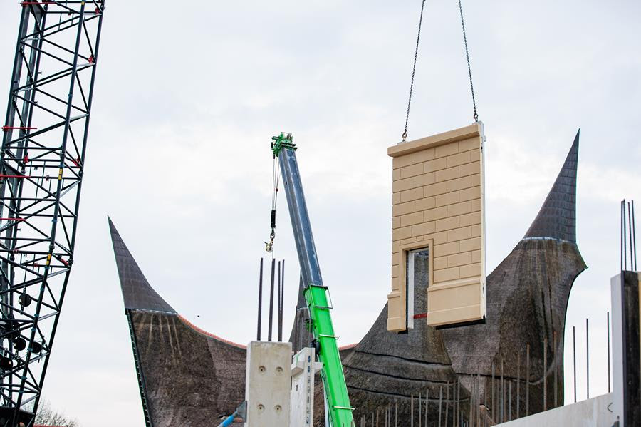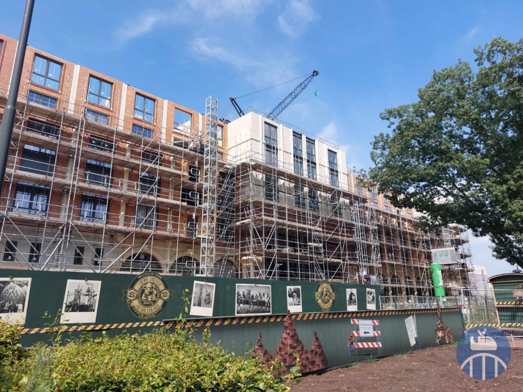 Si la fermeture forcée du parc du 19 Décembre 2021 au 25 Janvier 2022 à cause de la pandémie avait été mise à profit pour effectuer les travaux préparatoires (notamment souterrains) de construction du nouvel hôtel, le gros œuvre s’est poursuivi alors que le parc était opérationnel : 10.000 mètres cubes de sable ont déjà été excavés derrière l’entrée principale et 380 trous d’une profondeur additionnée de 6 km ont été forés dans le sol dans lesquels 2500 mètres cubes de béton ont été coulés pour les fondations. Le bâtiment, lui, est un énorme puzzle de plus de 350 éléments préfabriqués totalisant une superficie de 5400 m². Notez qu’une partie du parking fut réaménagée en chantier de construction pour l’occasion. Enfin, précisons que l’hôtel était initialement prévu pour 2024, mais que sa finalisation a été reportée suite à la faillite de l’une des entreprises participant au chantier.