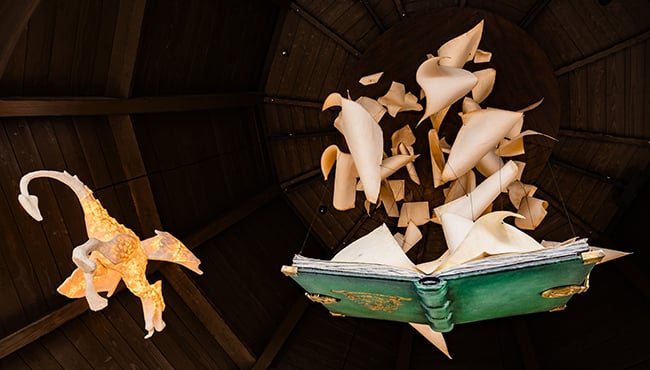 Plus largement, c’est toute la place d’entrée du parc qui a été remodelée :  l’ancienne Dwarrelplein a en effet été transformée en une zone avec des sentiers de promenade agréables, des étangs et beaucoup de verdure : l’Île des Cinq Sens, en lien direct avec le bâtiment d’entrée existant et dénommé Maison des Cinq Sens. Cette nouvelle zone fait désormais office de couverture de livre : c’est là où commencent et se terminent toutes les visites au cœur de l’Univers enchanté.