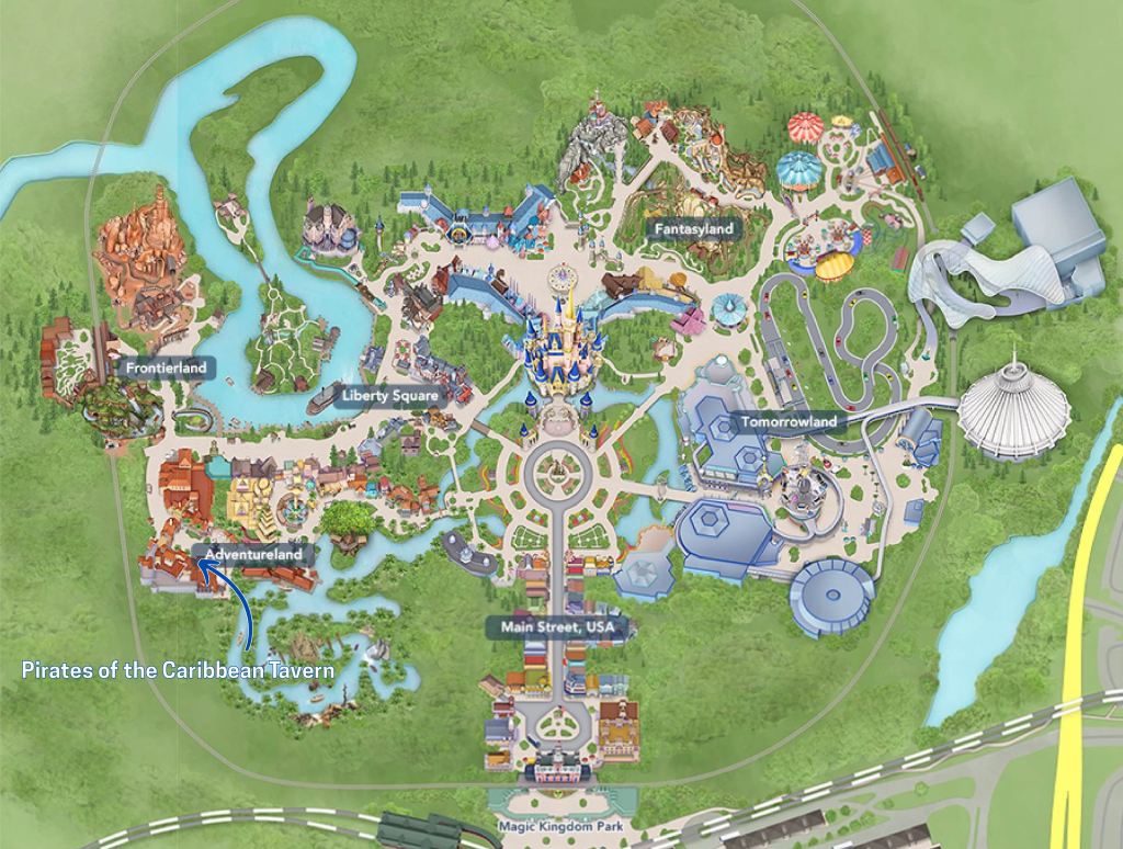 Ce pub de pirates a été créé par la Capitaine Meridian Goldwyn et son acolyte Rummy (le perroquet pirate), l’intendant du lieu. Il est bien évidemment inspiré de l’attraction Pirate of the Caribbean et signe le retour de Rummy aka Peg-Leg Pete (ou Barker Bird), un perroquet pirate qui invitait les visiteurs à entrer dans la file d’attente de l’attraction entre 1973 et 2006.