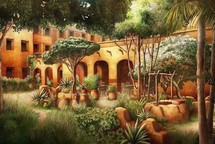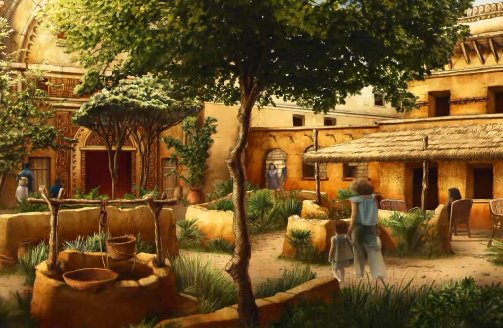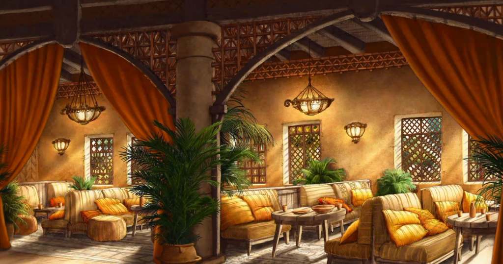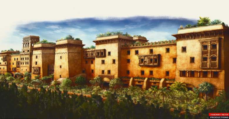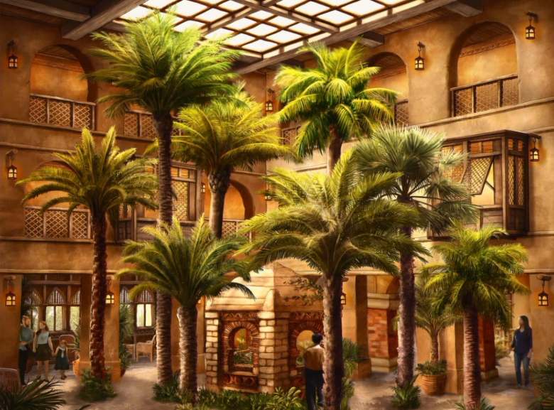 L’intérieur de l’hôtel sera divisé en 4 quartiers (Perse, Mésopotamie, Égypte et Phénicie), chacun avec leur propre cour et des façades rappelant leur architecture respective.