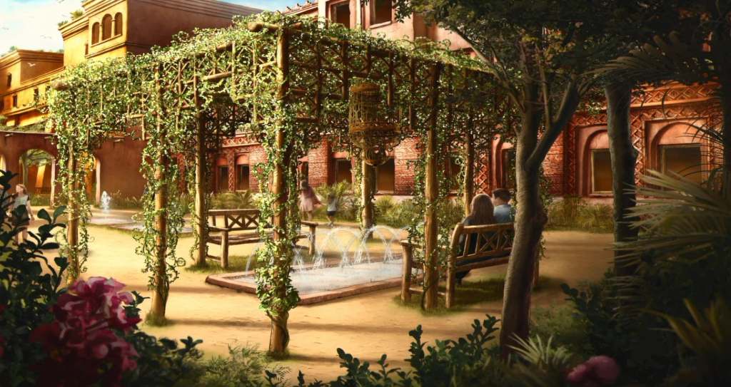 Annoncé officiellement en Mai 2025, le Parc Astérix accueillera un nouvel hôtel en 2027, thématisé sur l’orient et prenant l’aspect d’un grand caravansérail. Il comptera 300 chambres et un centre de conventions et séminaires.