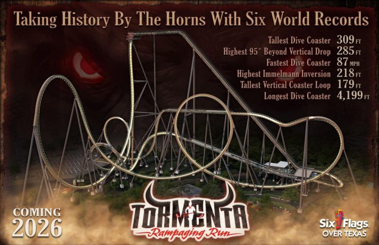 Six records du monde, c’est le palmarès affiché pour le futur coaster de Six Flags Over Texas ! Tormenta Rampaging Run sera en effet (et entre autres) le plus haut, le plus rapide, le plus long Dive Coaster au monde, ce qui en fait même un nouveau modèle : le Giga Dive Coaster !
