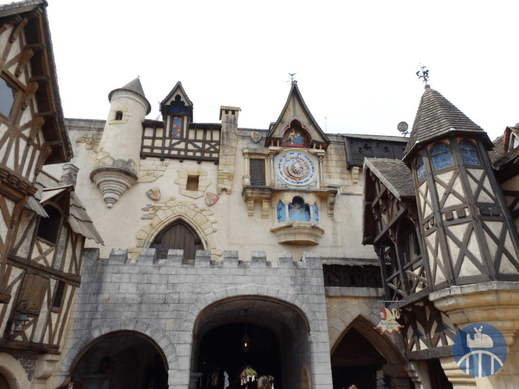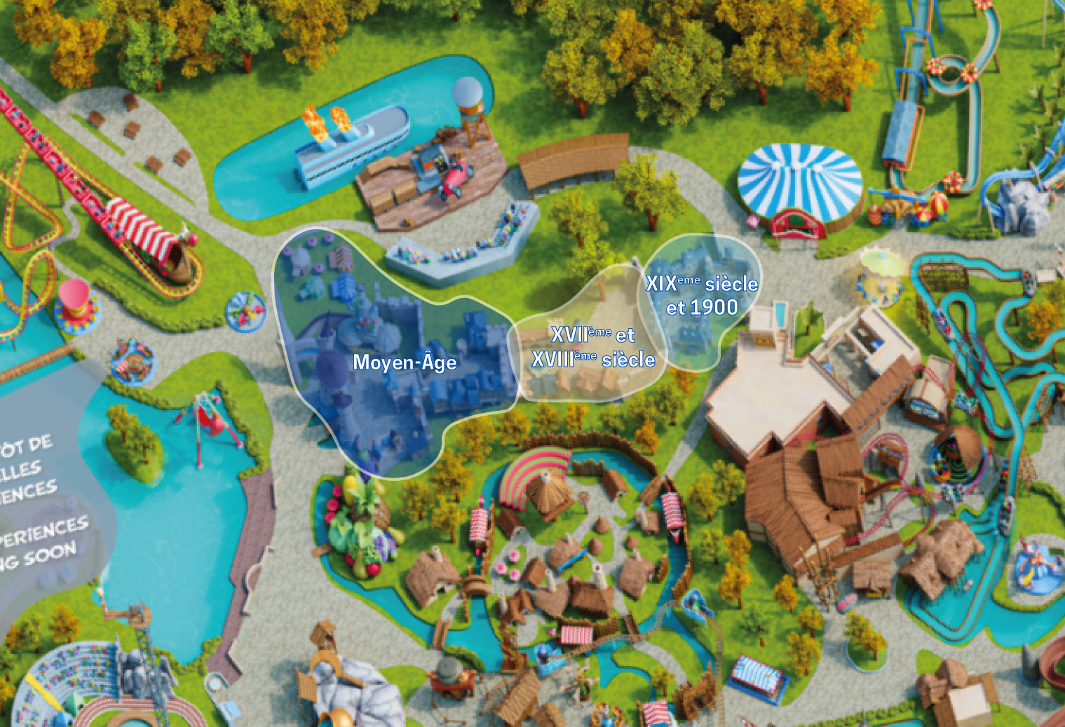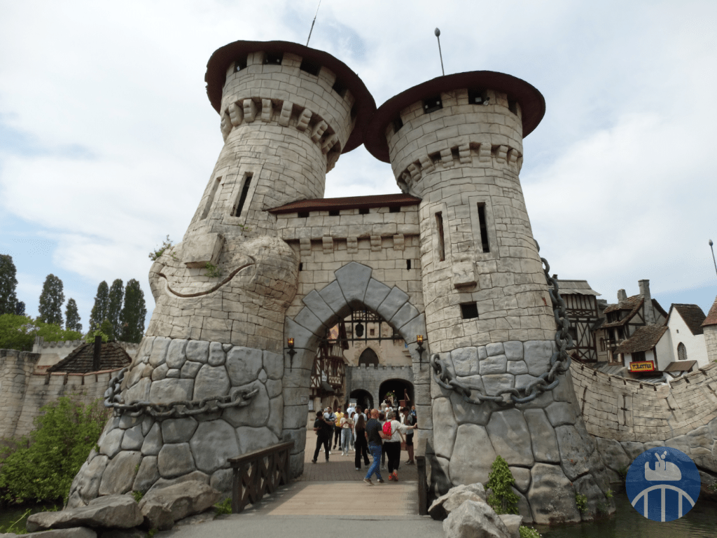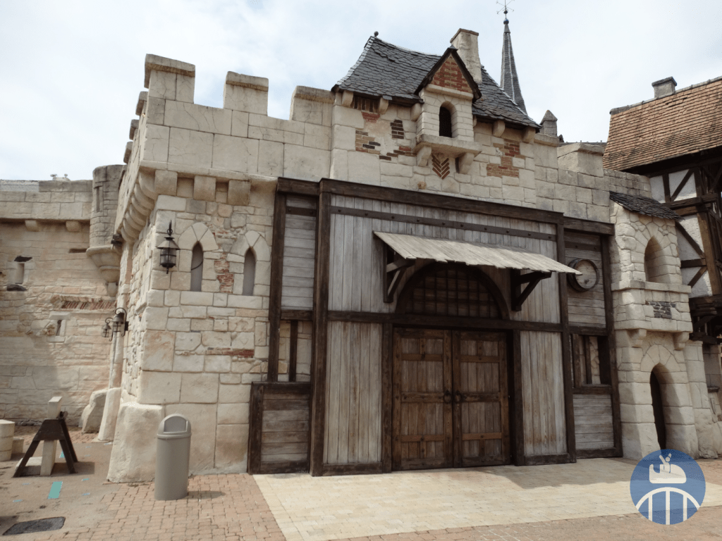 Le voyage débutait aux abords du lac (entre la Forêt d’Idéfix et la zone Vikings) par le Moyen-Âge, avec, pour la partie en extérieur : le Mini Carrousel, les tours amoureuses, le restaurant La Halte des Chevaliers, deux petits points de vente snack et le train fantôme Transdemonium. La partie en intérieur qui suit présentait des vrais métiers de l’époque féodale (à l’ouverture du parc). En 2025, on y trouvait Le Café O’dal et la boutique souvenirs Au Chaperon d’Or.