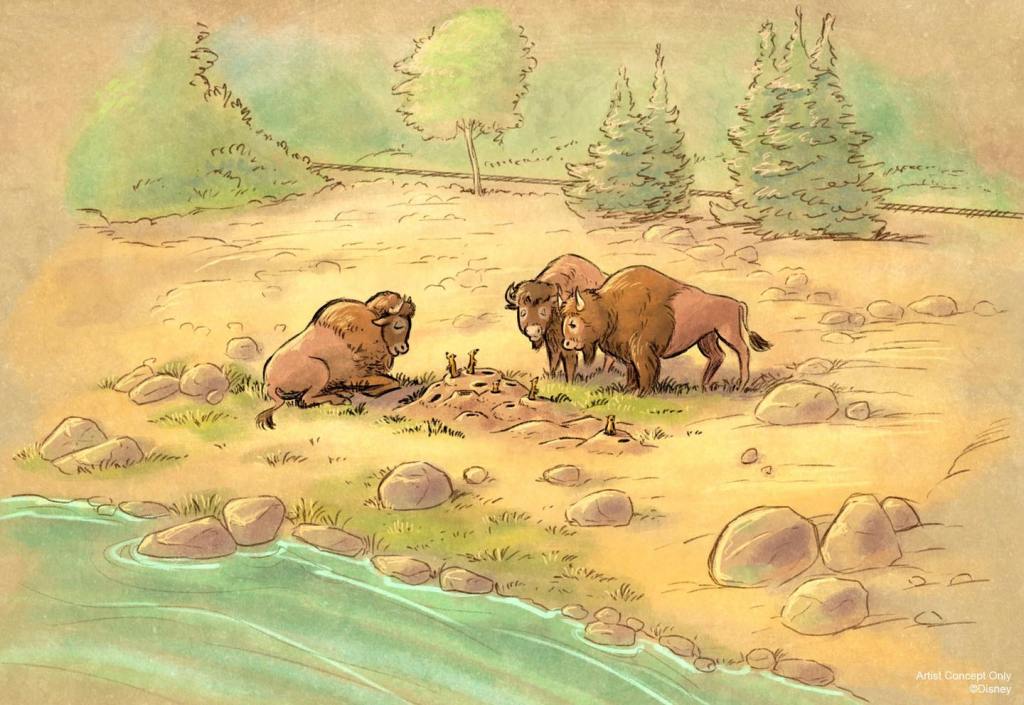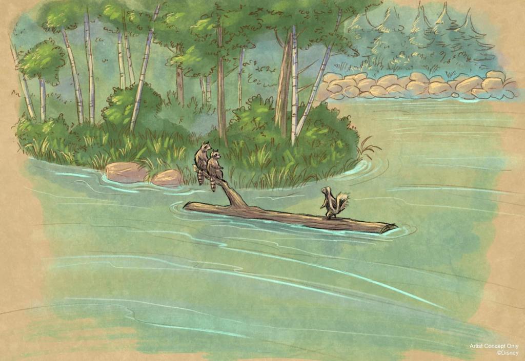 Si le parcours compte déjà différents éléments de thématisation comme la célèbre cabane de Catfish Joe, le plus vieil habitant du fleuve, des geysers inspirés de ceux de Yosemite en Californie, ou encore un squelette de tyrannosaure figé dans la lave (pour ne citer que ces quelques exemples), des nouveautés ont été annoncées dans le cadre de cette réhabilitation ! Ainsi devrait-on voir de nouvelles représentations d’animaux tels que des ratons laveurs, une moufette, des cerfs, des biches et des bisons qui auront pour particularité d’être inspirés de dessins préliminaires de l’Imagineer de légende Marc Davis !