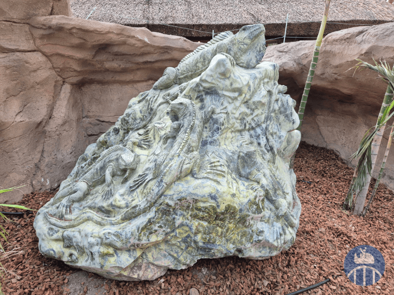 Ne manquez pas la sculpture dans la serpentine, une pierre d’Amérique du Sud, représentant des iguanes tout proches.