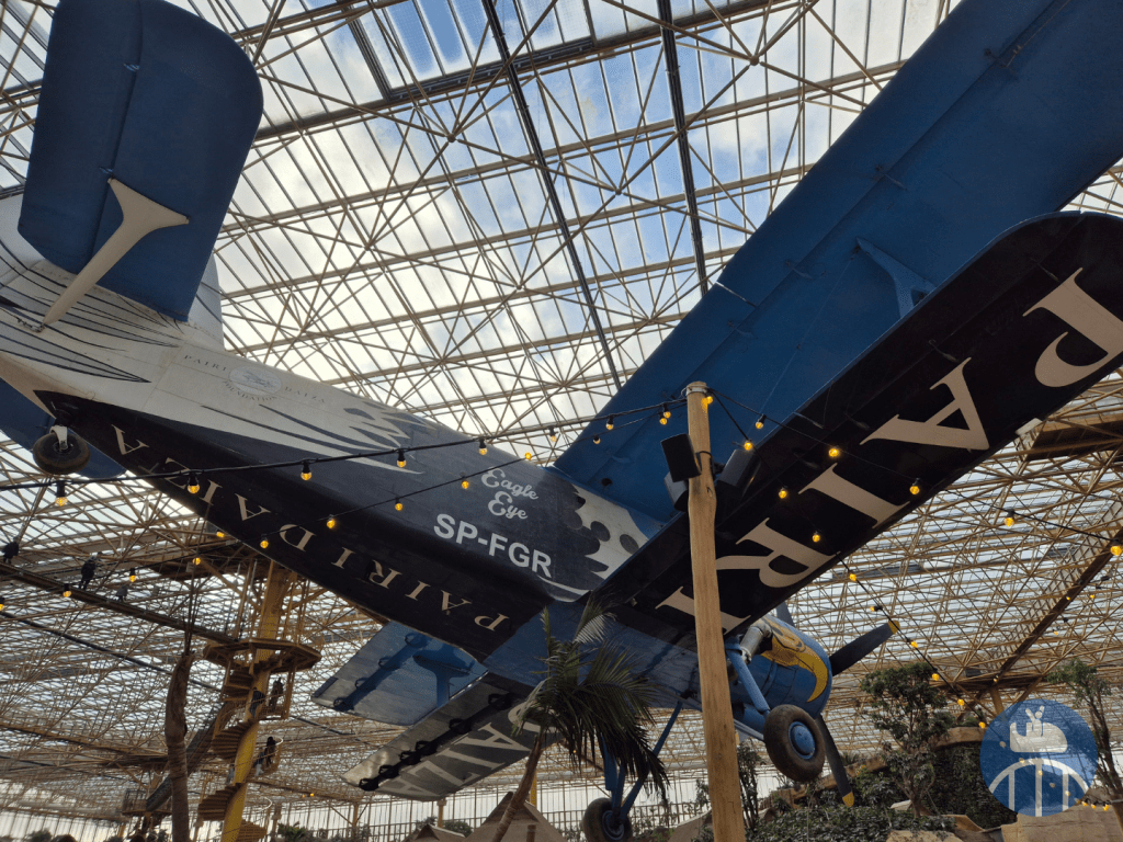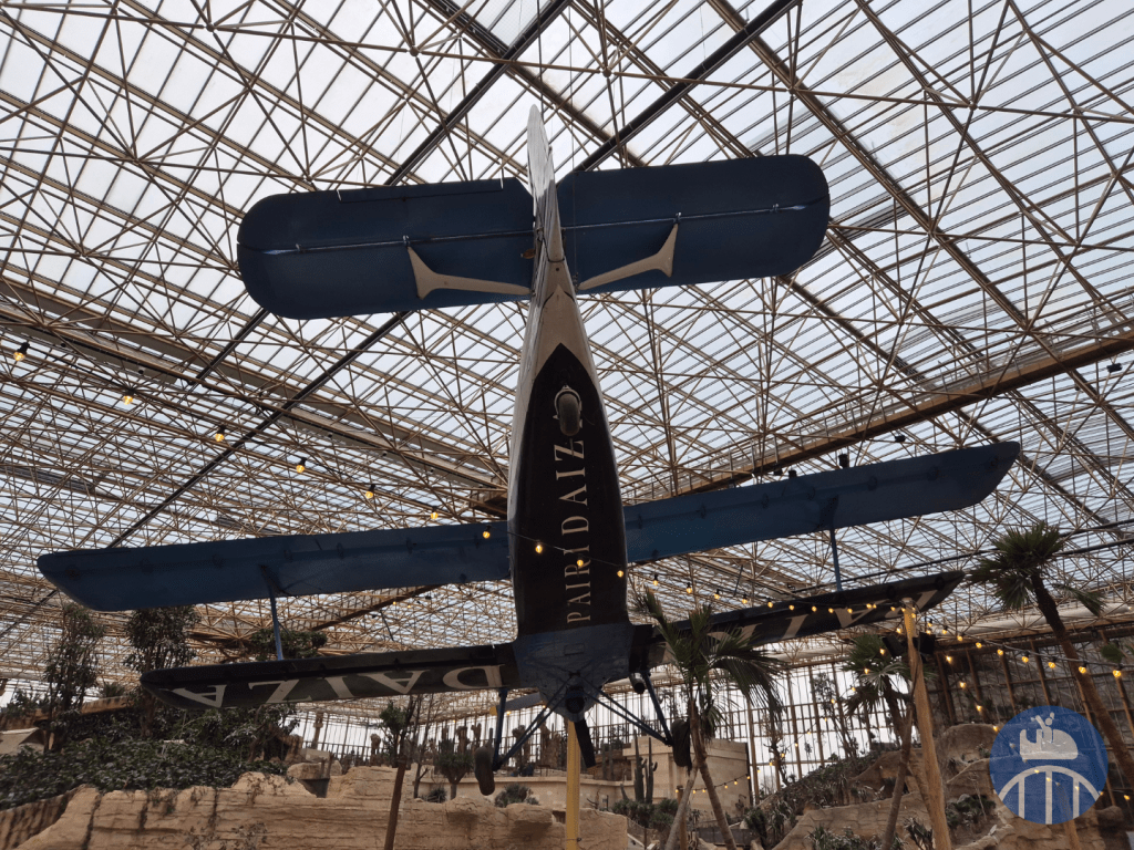 Non loin de la grande terrasse, Eagle Eye, un biplan monomoteur Antonov-2 « Colt », est suspendu à la charpente d’Edenya. Il fut sauvé en 2014 près de Cambrai par Eric Domb, le fondateur du parc, puis restauré en Pologne, son pays d’origine. Sur son fuselage, vous observerez un pygargue de Steller peint d’après un dessin original de Jean-François Charles.