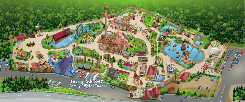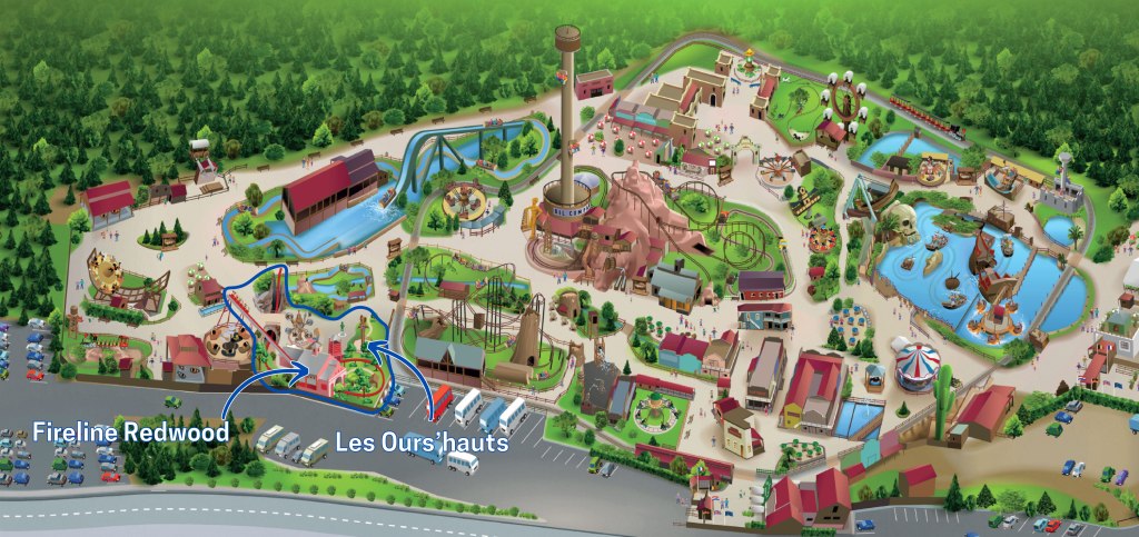 Cette extension de la zone bucheronne sera située à la place de bâtiments techniques et de l’attraction Joly Jumper, qui sera déplacée entre le Rio Grande et La Cavalerie. Fireline Redwood sera entourée de Timber Drop, La Rivière Castor et Les Santiags.