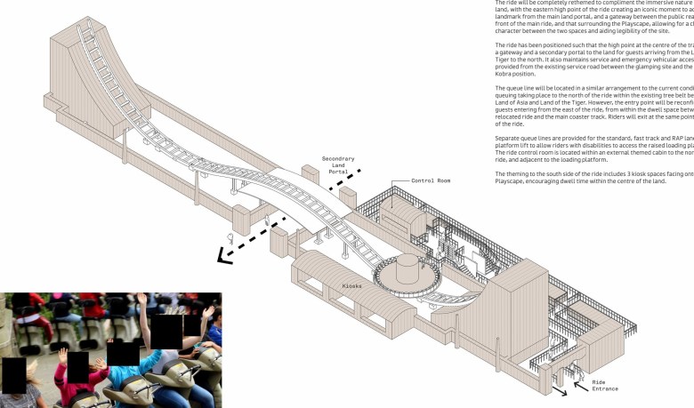 Un nouveau Flat Ride couvert, pour l’instant de type inconnu, se situera au fond de la zone, à la place de la volière des loriquets et de l’Explorer Glamping.