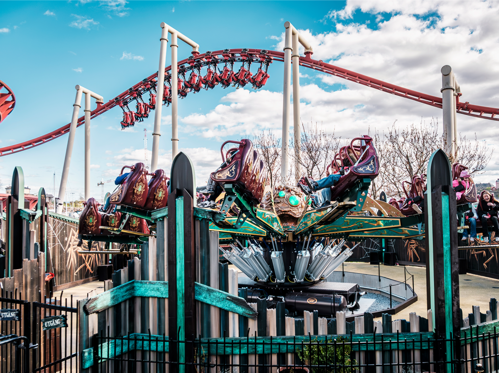 Un nouveau flat ride a ouvert à Gröna Lund en Suède en 2026. L’araignée fait tourner et sauter ses visiteurs le long de la jetée en remplacement d’un Tapis Magique.